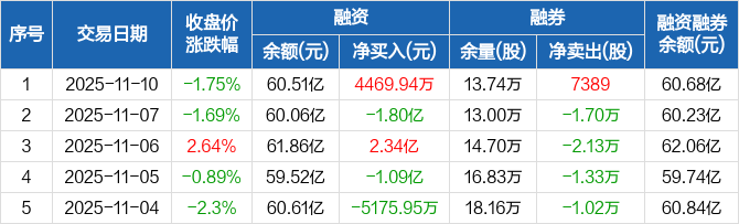 融资方面,当日融资买入6.02亿元,融资偿还5.58亿元,融资净买入4469.94万元。融券方面,融券卖出1.76万股,融券偿还1.03万股,融券余量13.74万股,融券余额1755.6万元。融资融券余额合计60.68亿元。