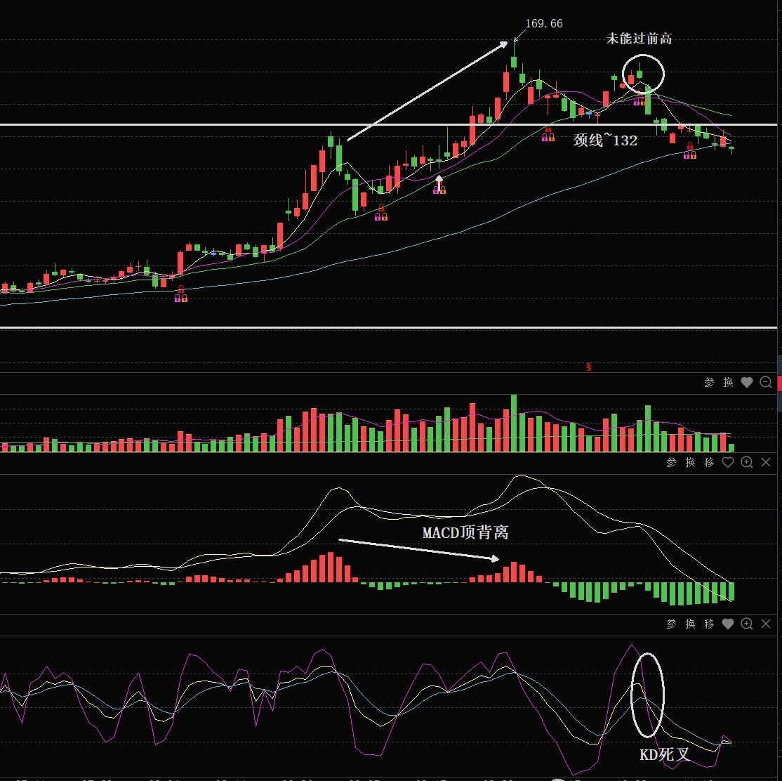 技术分析是很管用的,尽管很多人看不上。10月30日高开低走,10月31日跳空低开跌10个点,股价一举击穿5、10、20天均线。股价跌破颈线支撑~132成M头后,阶段顶部已确认。