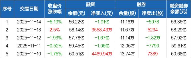 澜起科技融资融券信息显示,2025年11月14日融资净偿还1.91亿元;融资余额56.22亿元,较前一日下降3.29%。