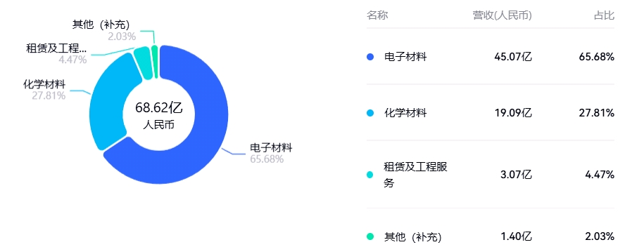 2024 年年报显示,电子材料业务收入达 45.07 亿元,占总营收的 65.68%。