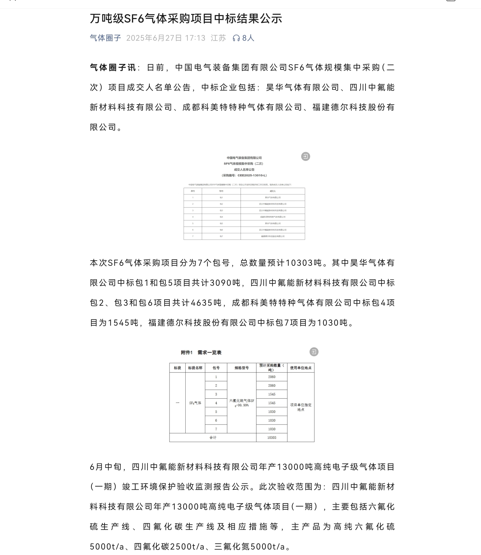 中国电气装备集团有限公司SF6气体规模集中采购(二次)项目成交人名单公告日前,中国电气装备集团有限公司SF6气体规模集中采购(二次)项目成交人名单公告,中标企业包括:昊华气体有限公司、四川中氟能新材料科技有限公司、成都科美特特种气体有限公司、福建德尔科技股份有限公司。本次SF6气体采购项目分为7个包号,总数量预计10303吨。其中昊华气体有限公司中标包1和包5项目共计3090吨,四川中氟能新材料科技有限公司中标包2、包3和包6项目共计4635吨,雅克科技全资子公司成都科美特特种气体有限公司中标包4项目为1545吨,福建德尔科技股份有限公司中标包7项目为1030吨。6月中旬,四川中氟能新材料科技有限公司年产13000吨高纯电子级气体项目(一期)竣工环境保护验收监测报告公示。此次验收范围为:四川中氟能新材料科技有限公司年产13000吨高纯电子级气体项目(一期),主要包括六氟化硫生产线、四氟化碳生产线及相应措施等,主产品为高纯六氟化硫5000t/a、四氟化碳2500t/a、三氟化氮5000t/a。