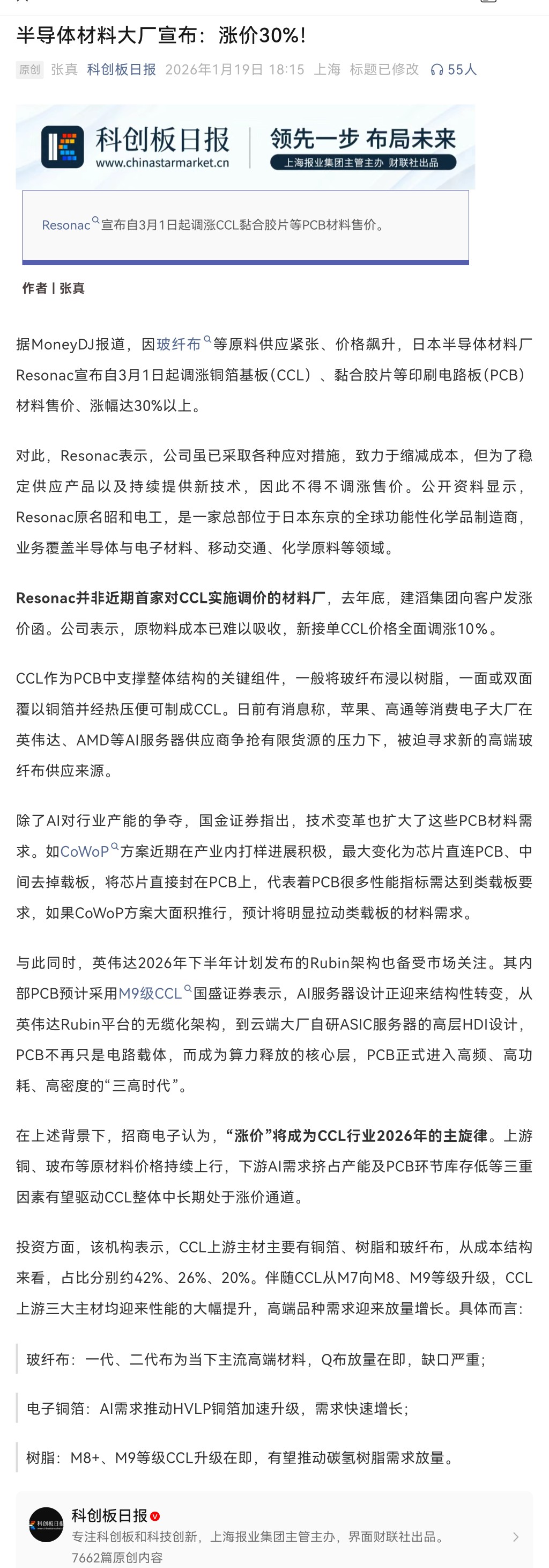 近期半导体材料行业涨价信号密集释放,日本大厂Resonac宣布3月起将CCL(铜箔基板)等PCB材料售价上调30%以上,国内建滔集团此前也已启动10%的调价,叠加上游原材料价格飙升与下游AI需求爆发,行业涨价周期已然开启。作为国内半导体材料龙头,雅克科技凭借在核心材料领域的深度布局,其产品涨价逻辑正逐步兑现。
