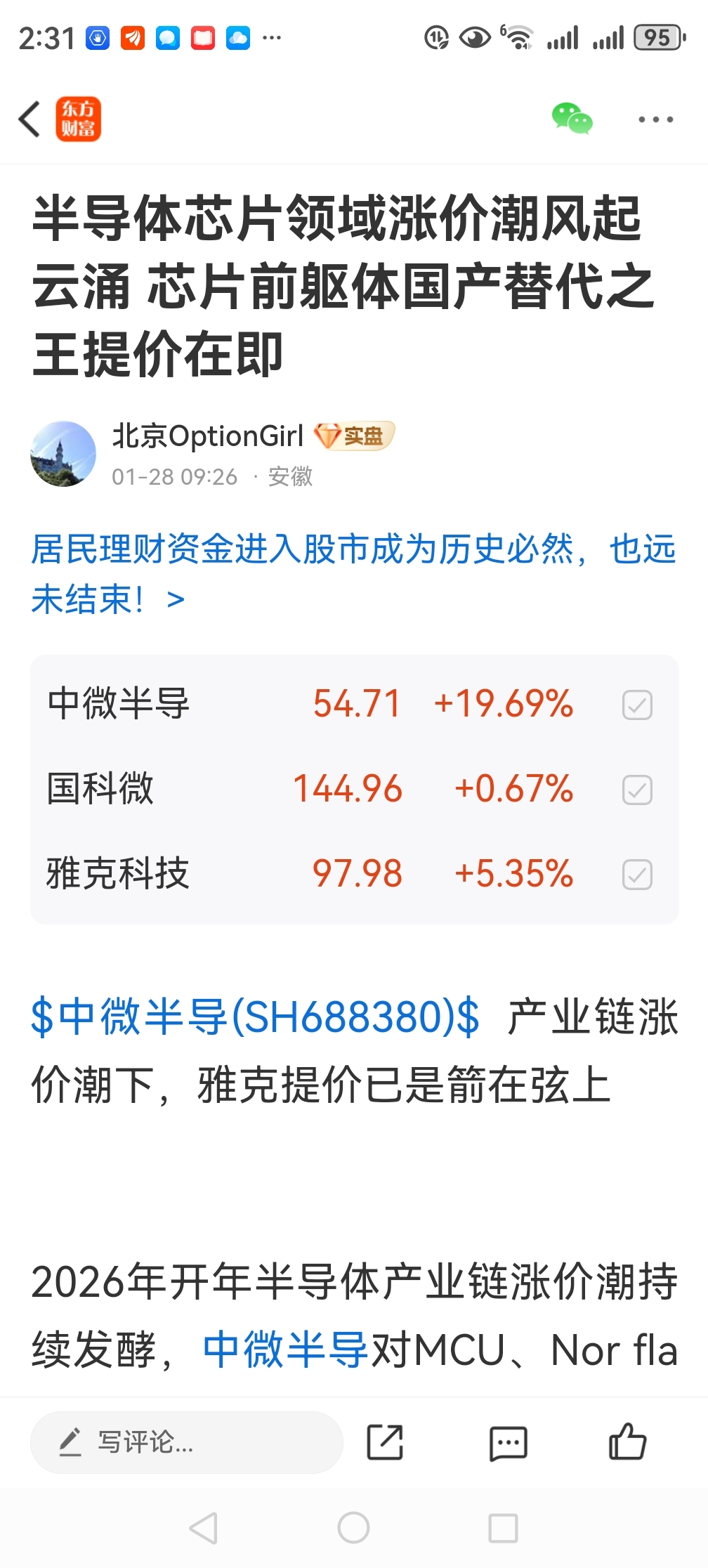 中微半导体(深圳)股份有限公司是一家以微控制器(MCU)研发与设计为核心的平台型芯片设计公司,为消费电子、智能家电、工业控制及汽车电子等领域提供芯片级一站式整体解决方案。中微半导近日公告显示其业绩爆发,预计2025年归属于上市公司股东的净利润为2.84亿元左右,同比增长107.55%左右。报告期内,新产品推出提升产品竞争力,公司产品出货量持续攀升;32位MCU出货量和营收占比扩大。截至27日收盘,中微半导股价报45.71元/股,最新市值为183亿元。另外,据上海证券报报道,国科微(300672.SZ)已对客户发出涨价函,宣布自1月起对合封512Mb的KGD(已知合格芯片)产品涨价40%,对合封1Gb的KGD产品涨价60%,对合封2Gb的KGD涨价80%,对外挂DDR的产品价格另行通知。$中微半导(SH688380)$