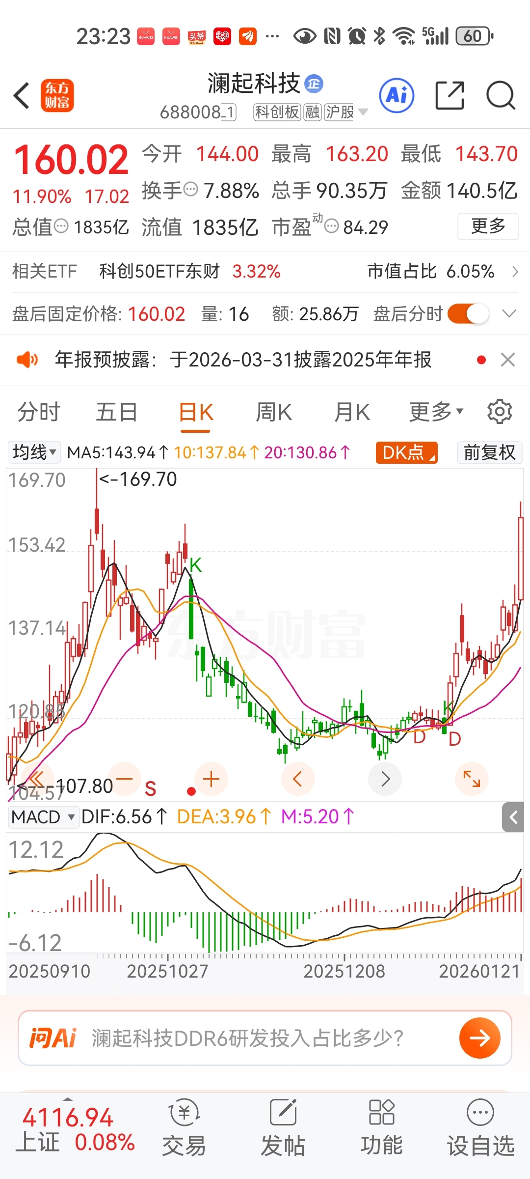 $澜起科技(SH688008)$ 到了压力位,今天追高的明天吃面