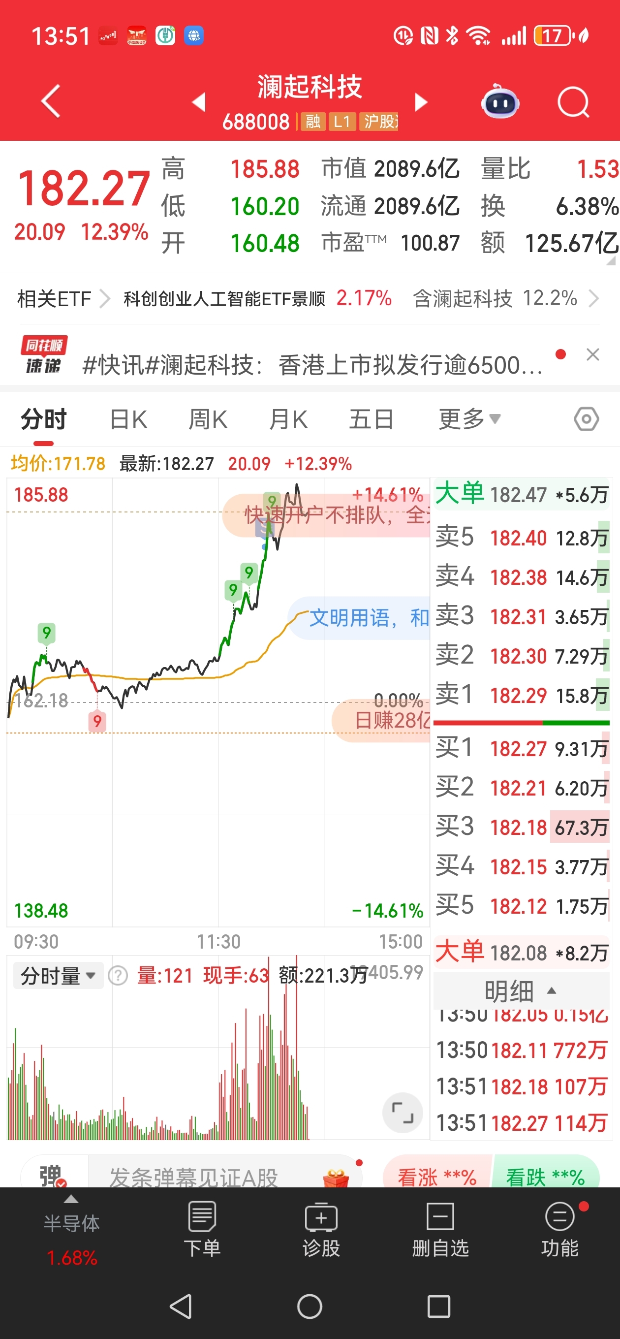 我想不到今天澜起科技太强势了。今天涨10个点的时候178.6元,我卖了1/3的仓