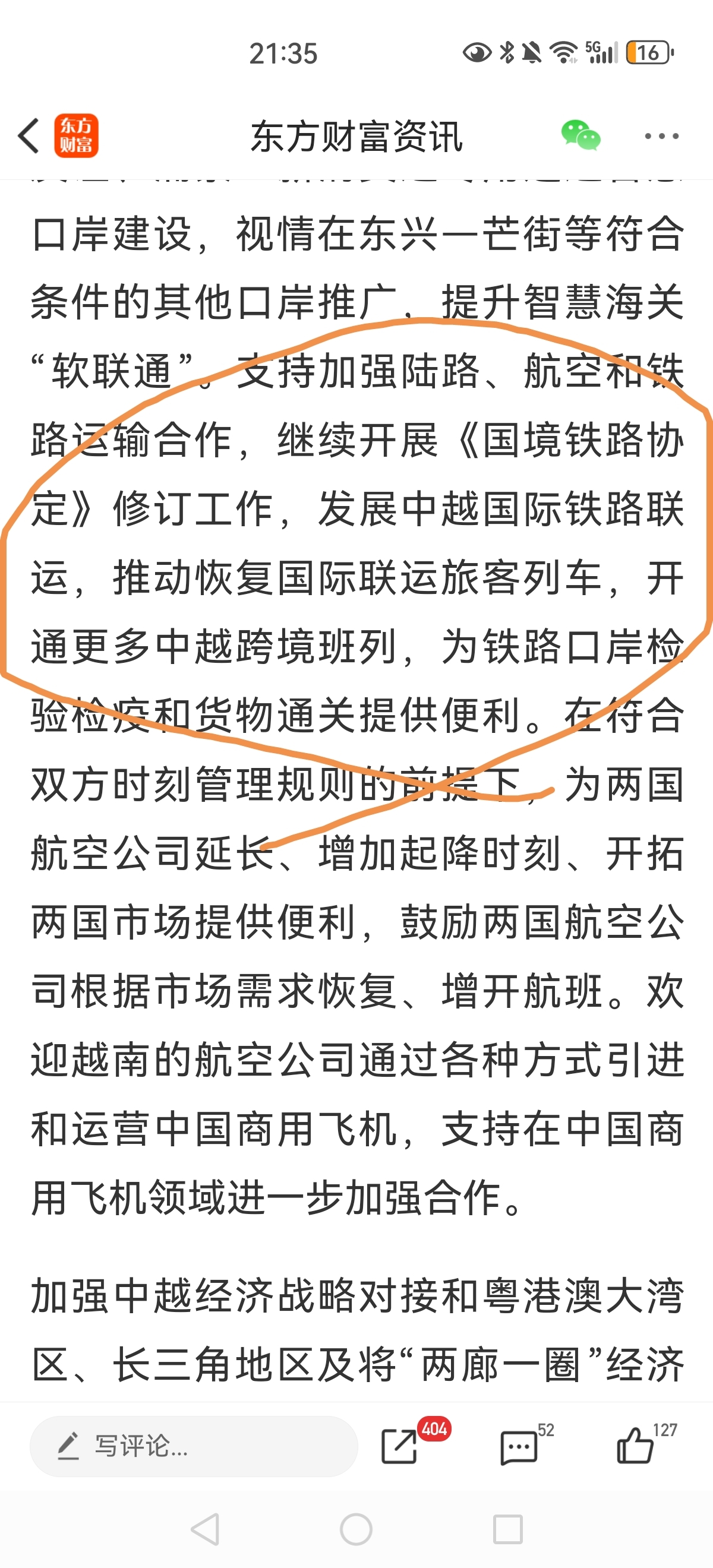 $中国通号(SH688009)$ 支持加强陆路、航空和铁路运输合作,继续开展《国境铁路协定》修订工作,发展中越国际铁路联运,推动恢复国际联运旅客列车,开通更多中越跨境班列,为铁路口岸检验检疫和货物通关提供便利。