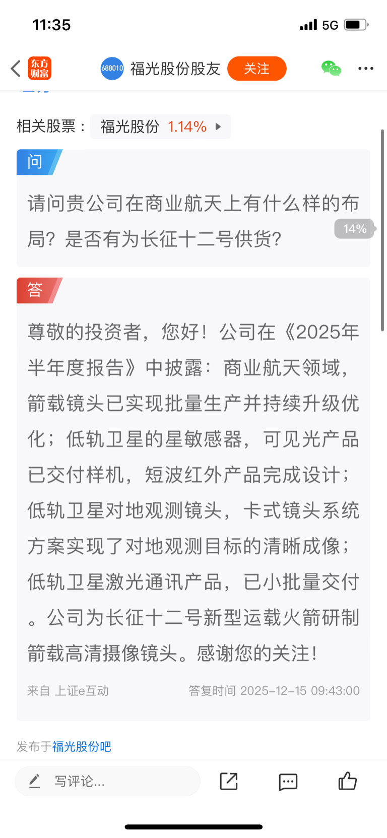$福光股份(SH688010)$ $超捷股份(SZ301005)$ $瑞华泰(SH688323)$ 尊敬的投资者,您好!公司在《2025年半年度报告》中披露:商业航天领域,箭载镜头已实现批量生产并持续升级优化;低轨卫星的星敏感器,可见光产品已交付样机,短波红外产品完成设计;低轨卫星对地观测镜头,卡式镜头系统方案实现了对地观测目标的清晰成像;低轨卫星激光通讯产品,已小批量交付。感谢您的关注!