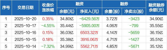 融资方面,当日融资买入2.55亿元,融资偿还3.2亿元,融资净偿还6429.56万元。融券方面,融券卖出4245股,融券偿还7668股,融券余量3.72万股,融券余额978.15万元。融资融券余额合计34.9亿元。