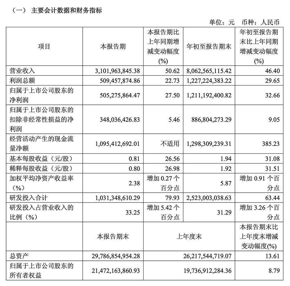 今年前三季度营业收入为80.63亿元,同比增长约46.40%;净利润为12.11亿元,同比增长了32.66%。前三季度研发投入为25.23亿元,同比增长了63.44%,占营收比例为31.29%。