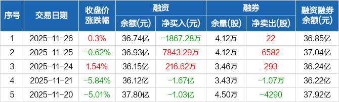 中微公司:融资净偿还1867.28万元,融资余额36.74亿元(11-26)