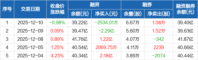 中微公司:融资净偿还2534.01万元,融资余额39.22亿元(12-10)
