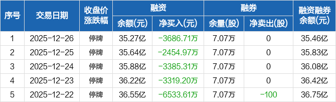 融资方面,当日融资买入0元,融资偿还3686.71万元,融资净偿还3686.71万元,连续6日净偿还累计2.15亿元。融券方面,融券卖出0股,融券偿还0股,融券余量7.07万股,融券余额1929.11万元。融资融券余额合计35.46亿元。
