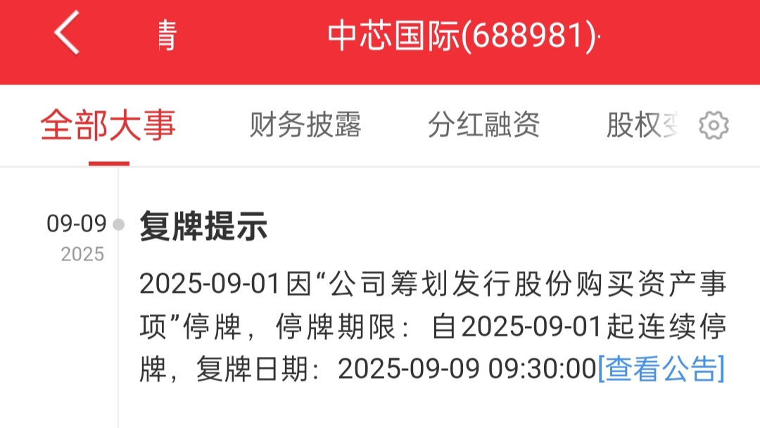 不要期待太高,中芯也是收购停牌,9.9号复牌当天跌了11厘米