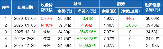 中微公司:融资净偿还3.41亿元,两市排名第三(01-06)