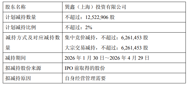 国产半导体设备龙头中微公司(688012)1月8日晚间公告称,持股10.94%的大股东巽鑫(上海)投资有限公司(以下简称“巽鑫投资”)因自身经营管理需要,计划自2026年1月30日~2026年4月29日,在符合法律法规规定的减持前提下,通过集中竞价或大宗交易方式减持公司股票不超过12,522,906股,即不超过总股本的2%。