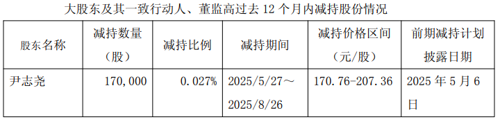 而过去一年内,尹志尧已减持17万股,占公司总股本的0.027%,减持价格区间为170.76元~207.36元/股。