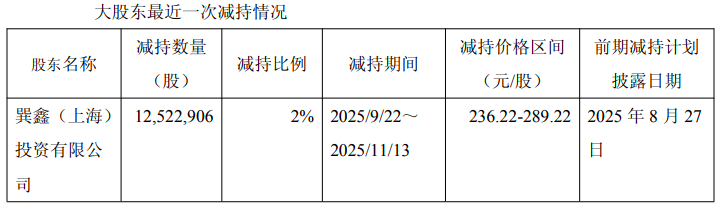 值得注意的是,这已是巽鑫投资近半年内的第二次减持,此前其在2025年9月至11月期间减持12,522,906股股份(减持比例2%),减持价格区间为236.22元~289.22元/股,套现金额颇为可观。
