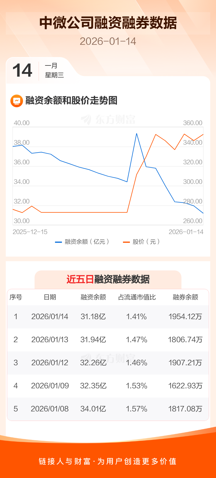 交易所最新数据显示,中微公司于2026年1月14日获融资买入6.42亿元,融资偿还7.18亿元,当日融资净偿还7634.17万元。目前,该股融资余额31.18亿,占流通市值比例为1.41%。