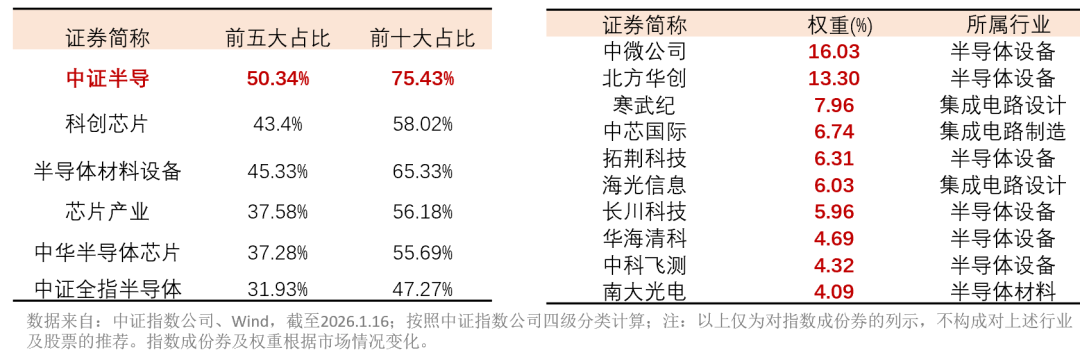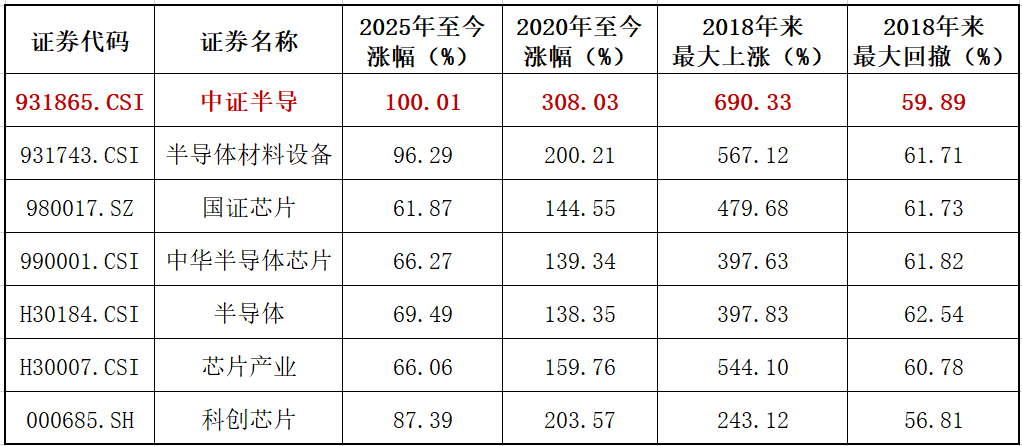 由于对龙头股高度聚焦,该指数较同类指数呈现更高弹性。对比科创芯片、半导体材料设备等同类主题指数,2025年至今,中证半导涨幅率先实现翻倍,2020年至今上涨308%、大幅跑赢科创芯片指数,且自上一轮半导体周期(2018年)至今最大涨幅超690%,均在同类指数中位居第一。