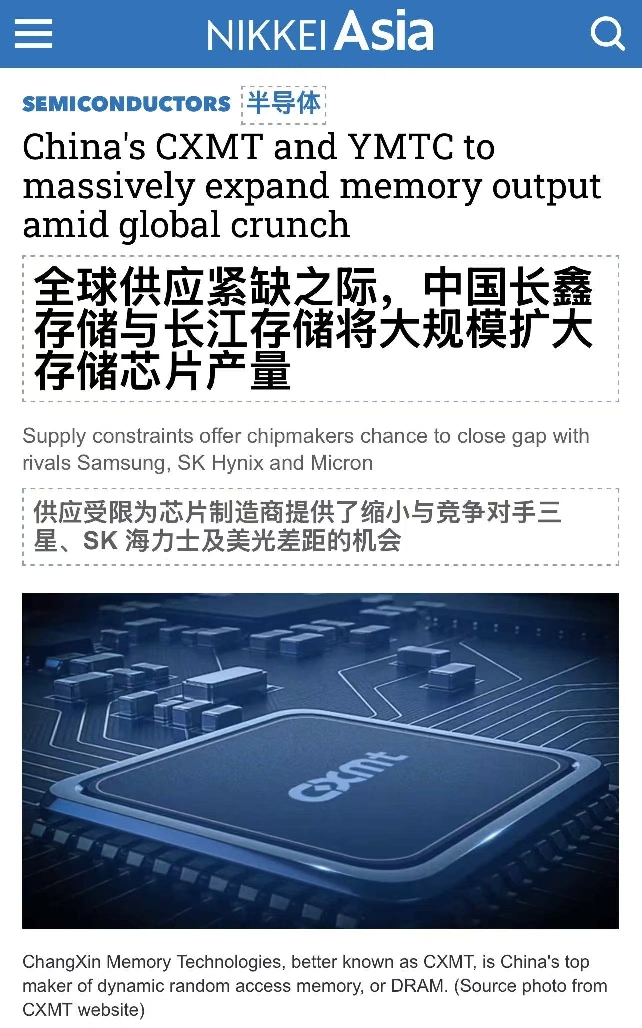 2月3日,日经新闻报道,中国CXMT和YMTC将在全球供应紧张之际大幅扩大内存产量,正启动创纪录级别扩产。