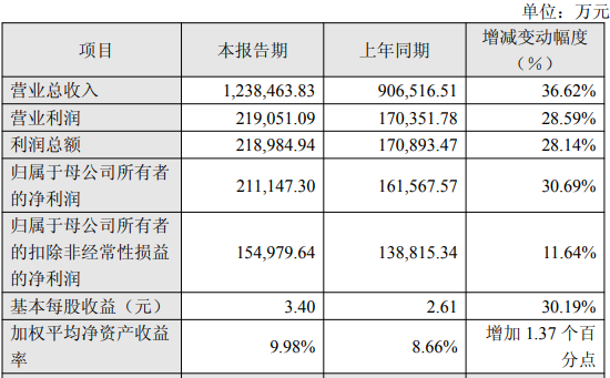 归属于母公司所有者的净利润约为21.11亿元,同比增加约4.96亿元,同比增加约30.69%,主要受益于半导体设备市场发展及公司产品竞争优势。