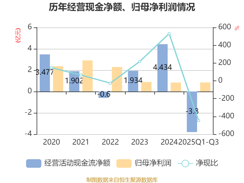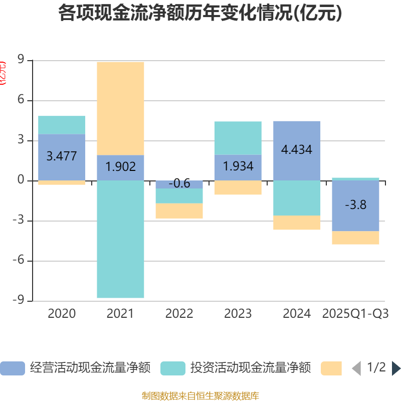 2025年前三季度,公司经营活动现金流净额为-3.8亿元,同比减少2.66亿元;筹资活动现金流净额-9829.81万元,同比减少898.01万元;投资活动现金流净额2020.42万元,上年同期为-1.62亿元。