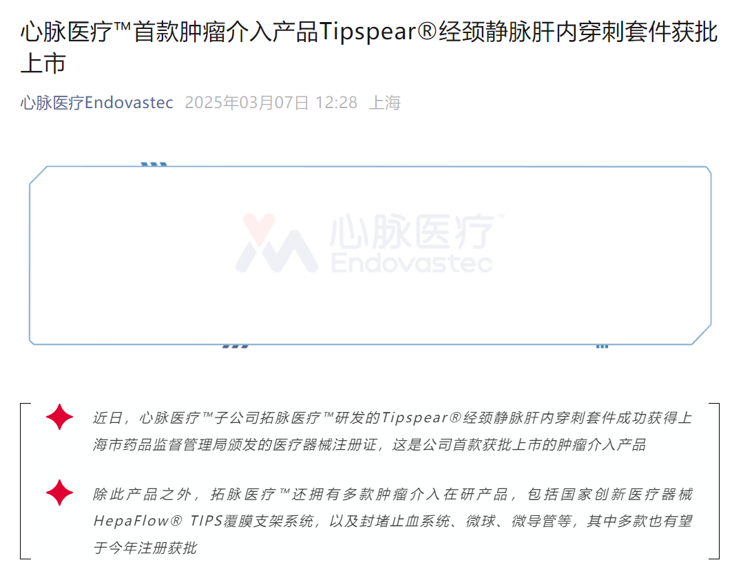 心脉医疗首款肿瘤介入产品Tipspear经颈静脉肝内穿刺套件获批上市