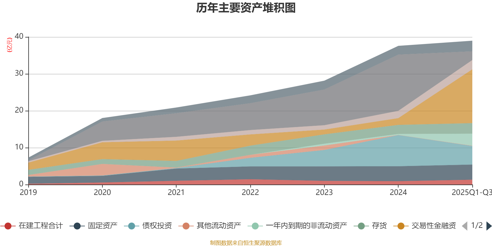 资产重大变化方面,截至2025年三季度末,公司货币资金较上年末减少84.52%,占公司总资产比重下降34.54个百分点;交易性金融资产合计较上年末增加700.01%,占公司总资产比重上升32.58个百分点;债权投资较上年末减少40.49%,占公司总资产比重下降9.6个百分点;一年内到期的非流动资产较上年末增加1085.11%,占公司总资产比重上升7.68个百分点。