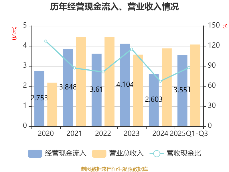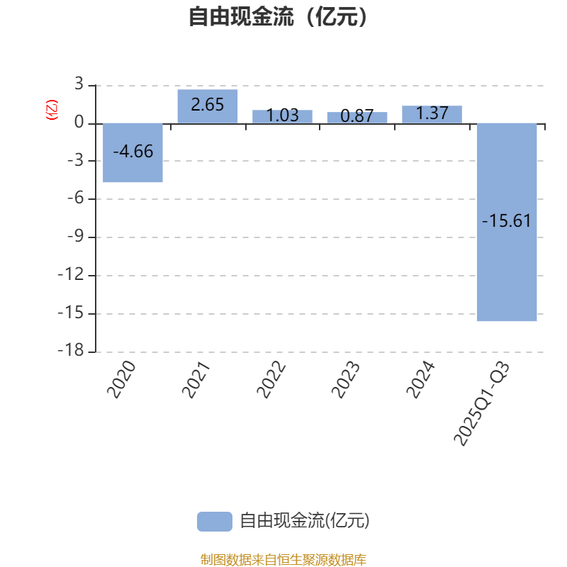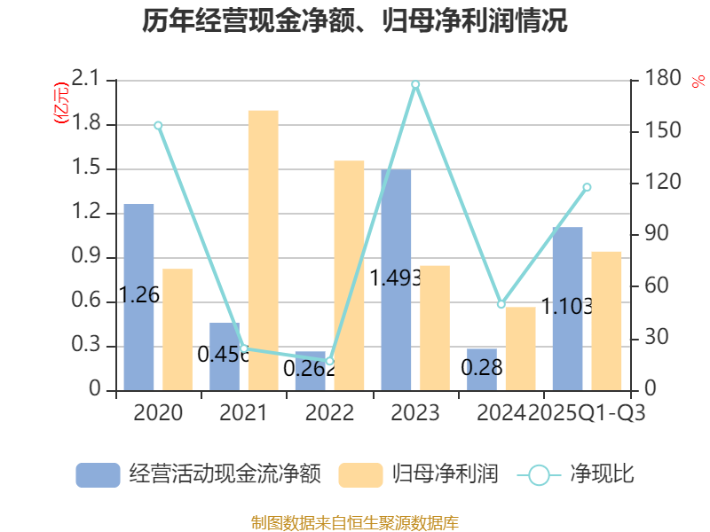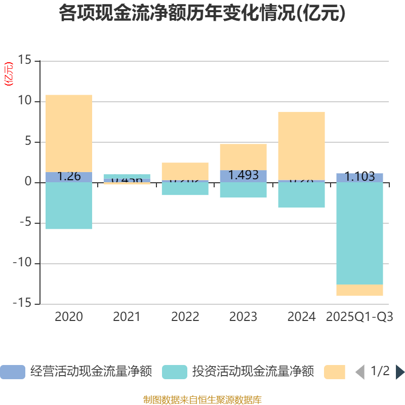 2025年前三季度,公司经营活动现金流净额为1.1亿元,同比增长122.21%;筹资活动现金流净额-1.38亿元,同比增加2.36亿元;投资活动现金流净额-12.63亿元,上年同期为-4.53亿元。