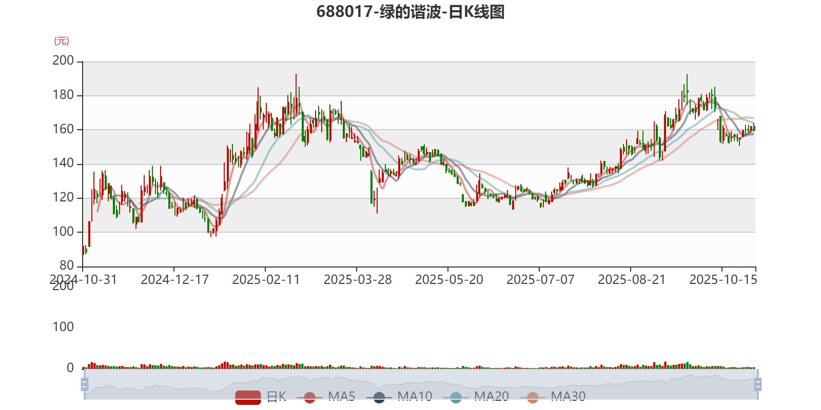 中证智能财讯绿的谐波(688017)10月31日披露2025年第三季度报告。前三季度公司实现营业总收入4.07亿元,同比增长47.36%;归母净利润9366.73万元,同比增长59.21%;扣非净利润7571.83万元,同比增长44.21%;经营活动产生的现金流量净额为1.1亿元,同比增长122.21%;报告期内,绿的谐波基本每股收益为0.5112元,加权平均净资产收益率为2.70%。