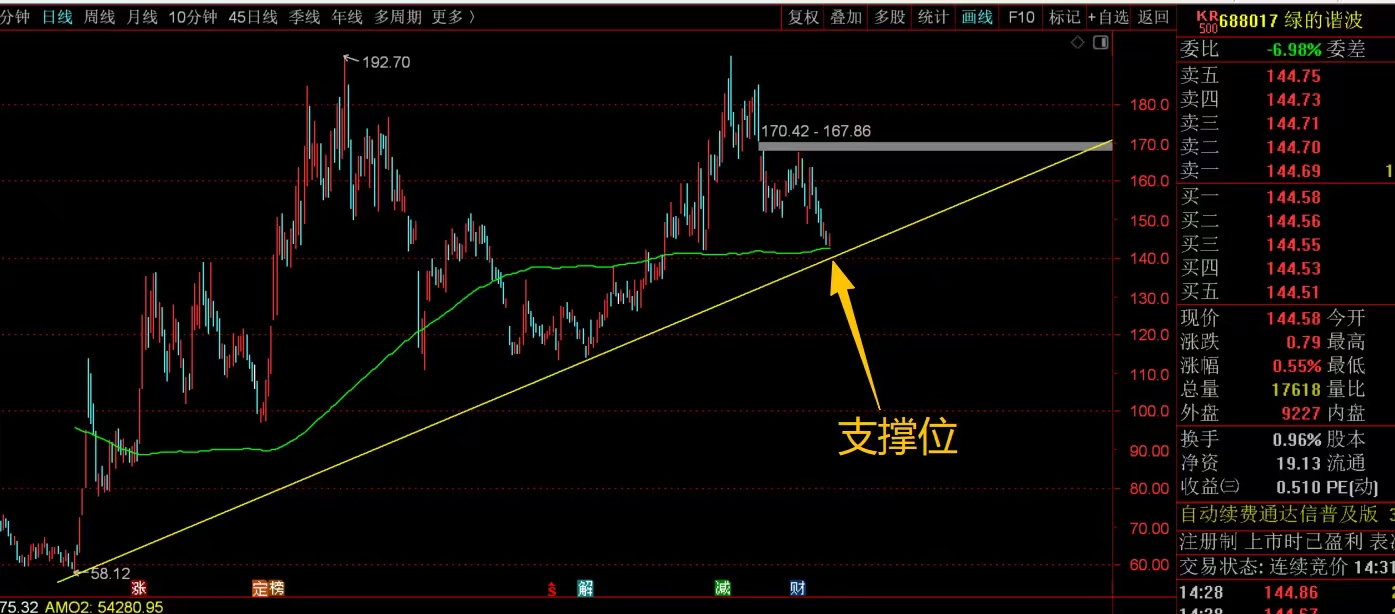 $绿的谐波(SH688017)$ 经过两个月的回落后,这里到了一个临界位置,一个是大均线142.6位置支撑,另一个是长期趋势线的低位支撑,这里就重点观察,能否稳住,能稳住超短可以来个反抽动作,稳不住就要注意破位风险了,需要控制仓位应对。