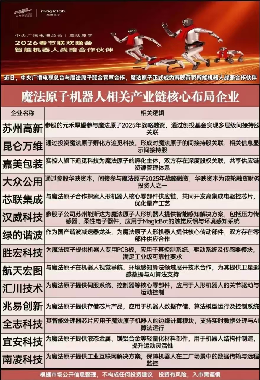 央视联合官宣魔法原子成为春晚机器人战略合作伙伴,相关产业链布局