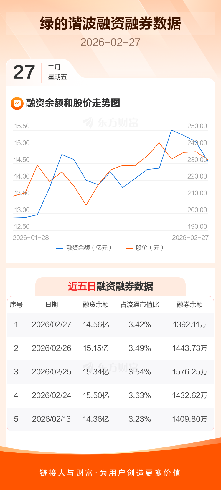 交易所最新数据显示,绿的谐波于2026年2月27日获融资买入1.59亿元,融资偿还2.18亿元,当日融资净偿还5887.05万元。目前,该股融资余额14.56亿,占流通市值比例为3.42%。
