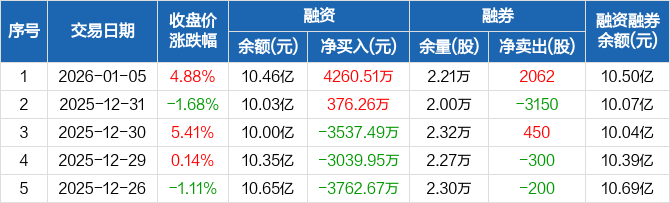 乐鑫科技:融资净买入4260.51万元,融资余额10.46亿元(01-05)