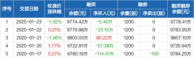 方邦股份:融资净偿还5.46万元,融资余额9774.42万元(01-23)