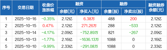 方邦股份:融资净买入6.38万元,融资余额2.12亿元(10-16)