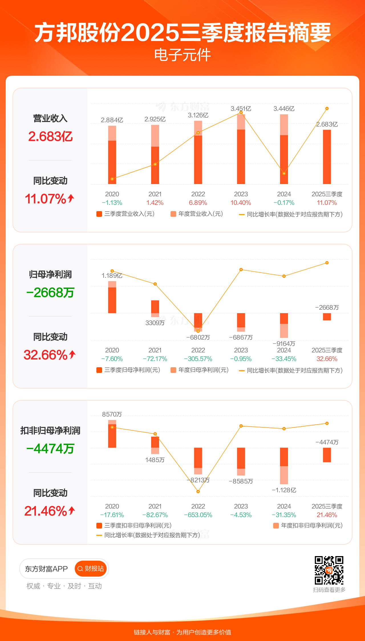 方邦股份10月30日发布2025年三季报显示,公司前三季实现营业收入2.68亿元,同比增长11.07%;归母净利润-2668.33万元;扣非归母净利润-4474.32万元。