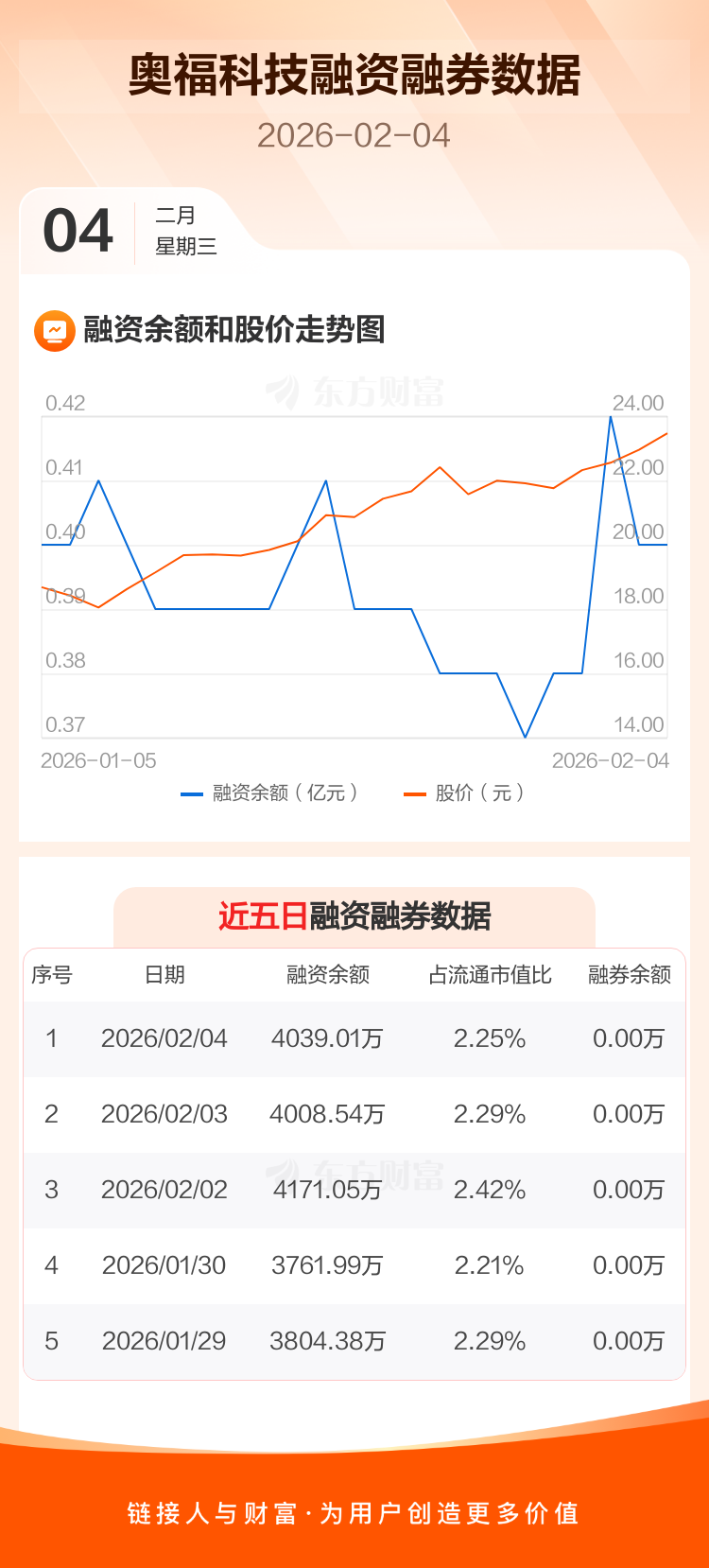 交易所最新数据显示,奥福科技于2026年2月4日获融资买入318.11万元,融资偿还287.64万元,当日融资净买入30.47万元。目前,该股融资余额4039.01万,占流通市值比例为2.25%。
