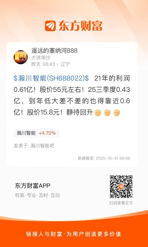 $瀚川智能(SH688022)$ 21年的利润0.61亿!股价55元左右!25三季度0.43亿,到年低大差不差的也得靠近0.6亿!股价15.8元!静待回升