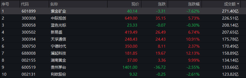 个股方面,紫金矿业成交额超271亿元居首,中际旭创、蓝色光标、新易盛成交额靠前。