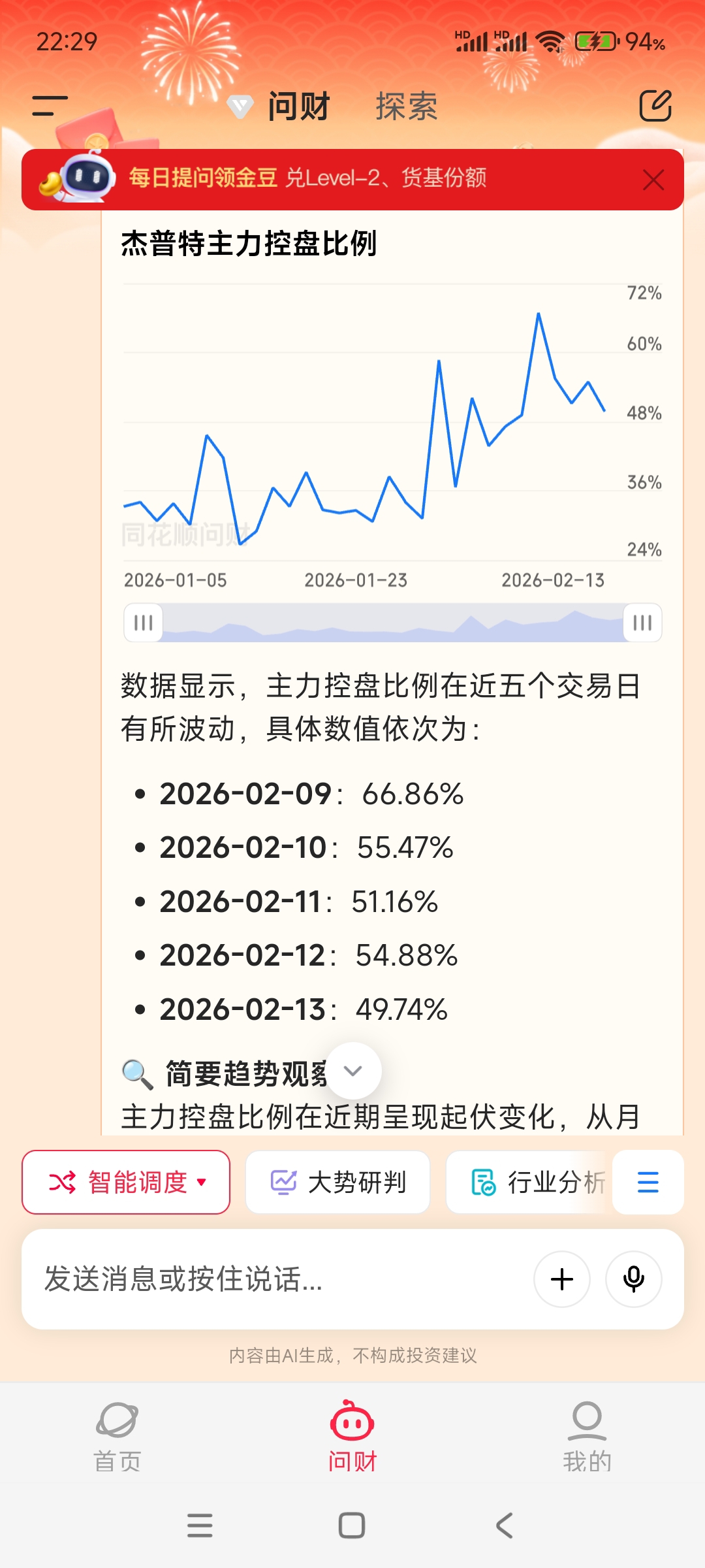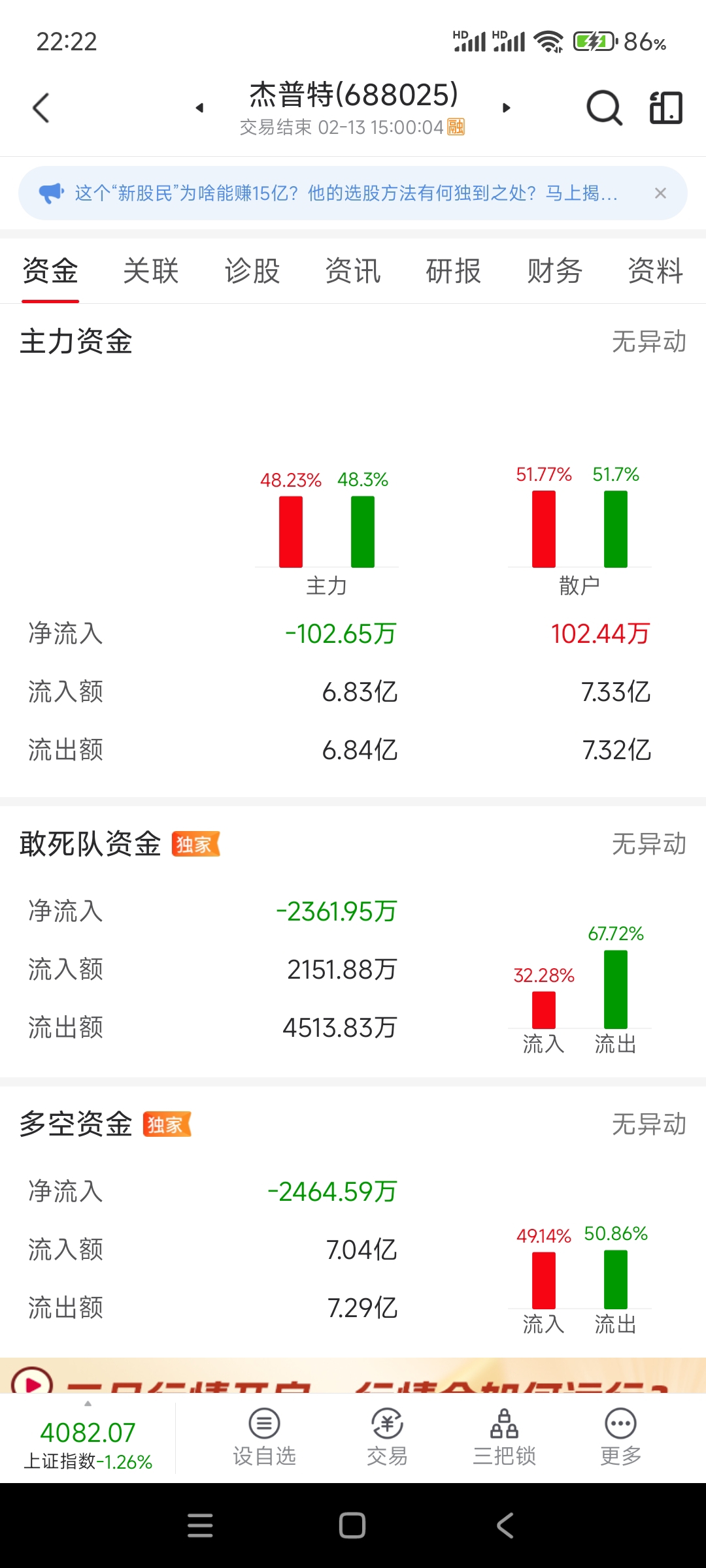 $杰普特(SH688025)$ 为什么看涨的还这么多74%?因为下跌这么多,主力仅流出102.65万元,主要是敢死队资金流出较多2361.95万元。近十一天成交量放大明显,股价涨幅较大,主力资金净流入也较多,主力控盘比例还高达49.74%,主力要全仓退出难度较大。