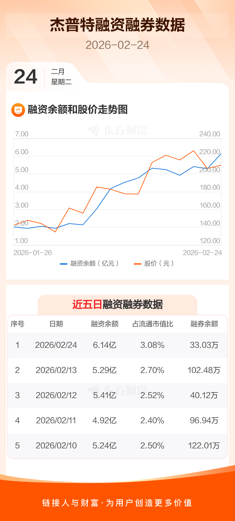 交易所最新数据显示,杰普特于2026年2月24日获融资买入2.12亿元,融资偿还1.28亿元,当日融资净买入8454.24万元。目前,该股融资余额6.14亿,占流通市值比例为3.08%。