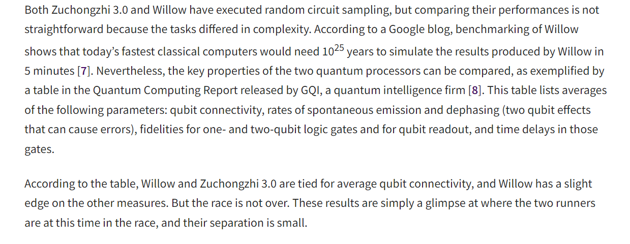然而,可以比较这两款量子处理器的关键属性,如量子智能公司GQI发布的《量子计算报告》中的一张表格。该表格列出了以下参数的平均值:量子比特连通性、自发辐射和退相干水平(可能导致错误的两种量子比特效应)、单量子比特和双量子比特逻辑门以及量子比特读出的保真度,以及这些门中的时间延迟。根据该表格,Willow和“祖冲之三号”在平均量子比特连通性方面打成平手,而Willow在其他指标上略有优势。但竞争并未结束。这些结果只是在这场竞赛中双方当前所处位置的简要一瞥,且双方差距很小。