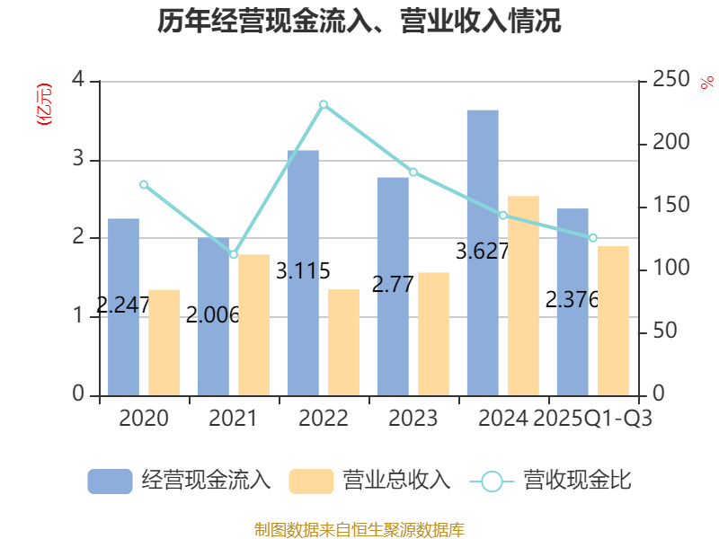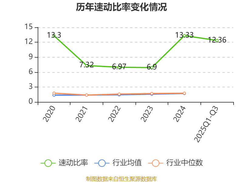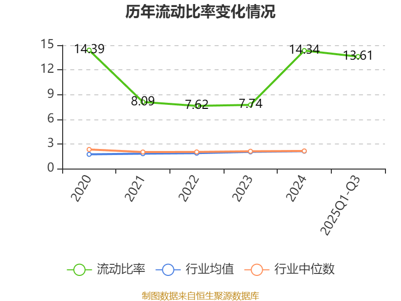 2025年前三季度,公司流动比率为13.61,速动比率为12.36。