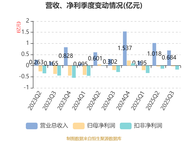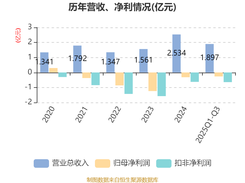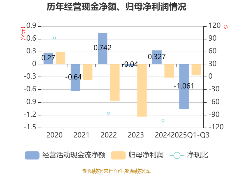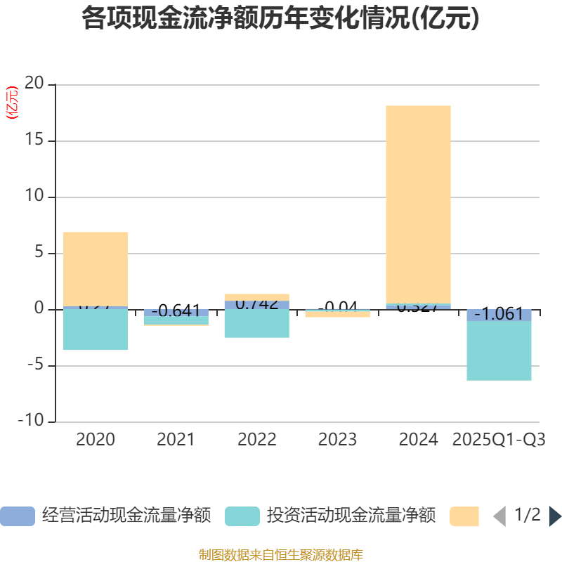 2025年前三季度,公司经营活动现金流净额为-1.06亿元,同比减少629.15万元;筹资活动现金流净额-138.04万元,同比减少915.83万元;投资活动现金流净额-5.3亿元,上年同期为-2498.03万元。