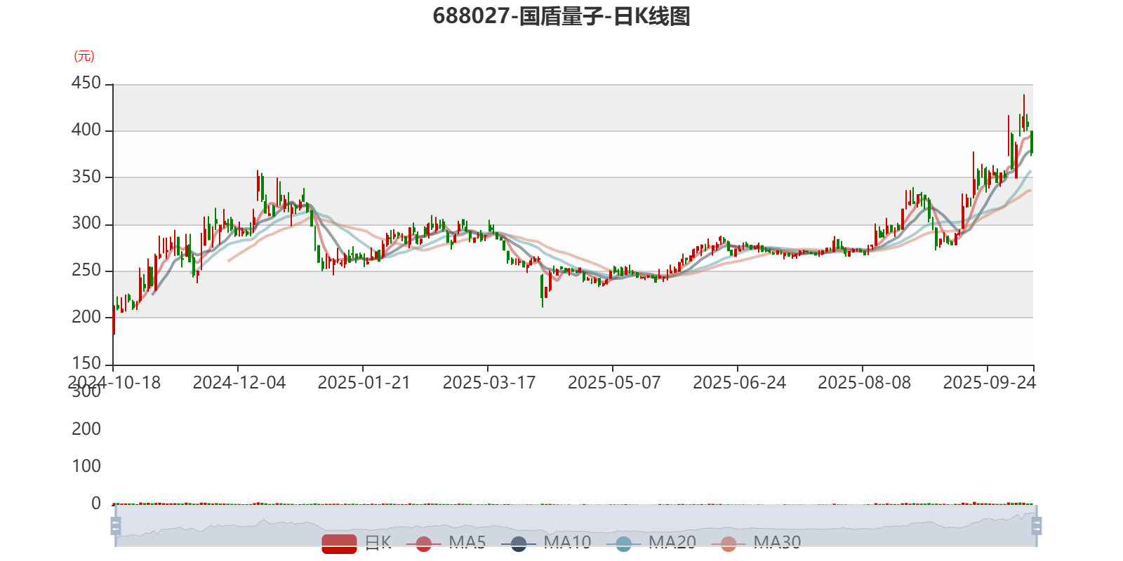 国盾量子(688027)10月18日披露2025年第三季度报告。前三季度公司实现营业总收入1.9亿元,同比增长90.27%;归母净利润亏损2646.96万元,上年同期亏损5511.75万元;扣非净利润亏损6432.56万元,上年同期亏损7325.79万元;经营活动产生的现金流量净额为-1.06亿元,上年同期为-9978.6万元;报告期内,国盾量子基本每股收益为-0.26元,加权平均净资产收益率为-0.82%。