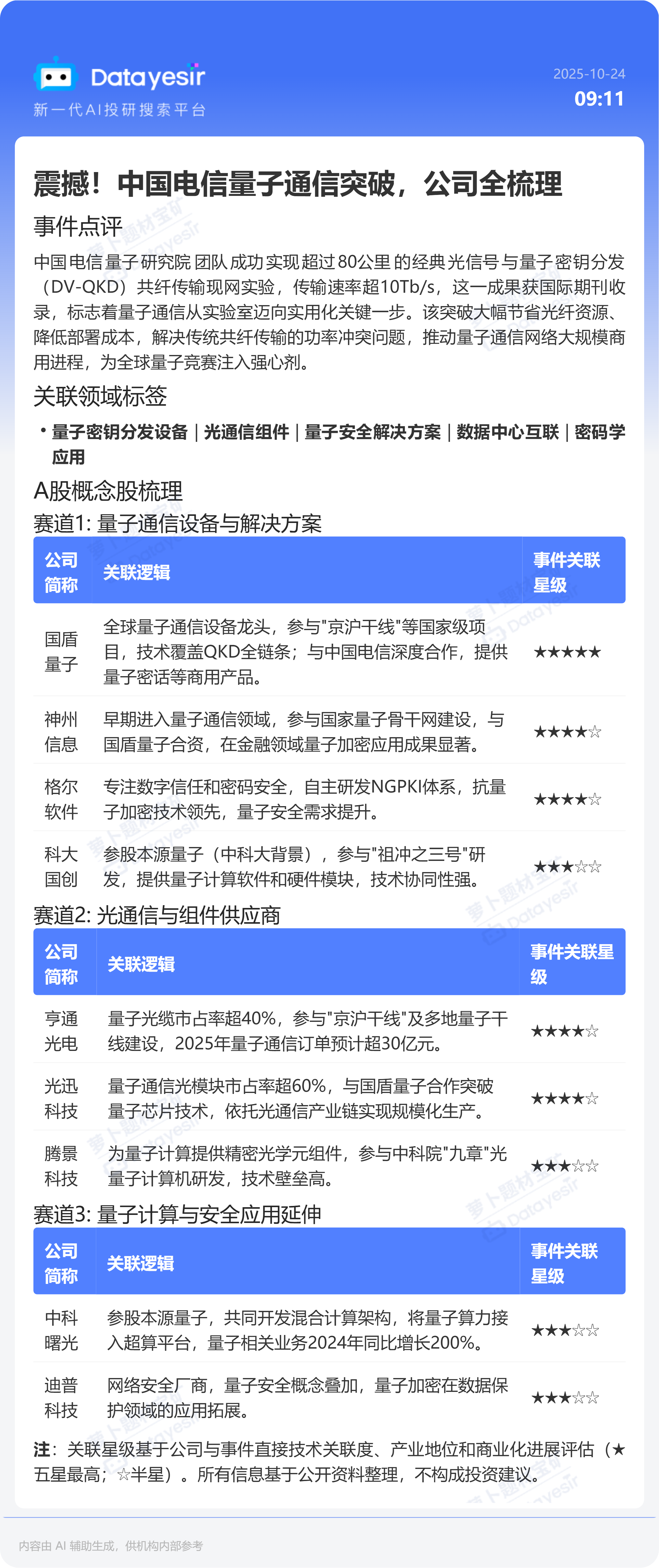 中国电信量子研究院团队成功实现超过80公里的经典光信号与量子密钥分发(DV-QKD)共纤传输现网实验,传输速率超10Tb/s,这一成果获国际期刊收录,标志着量子通信从实验室迈向实用化关键一步。