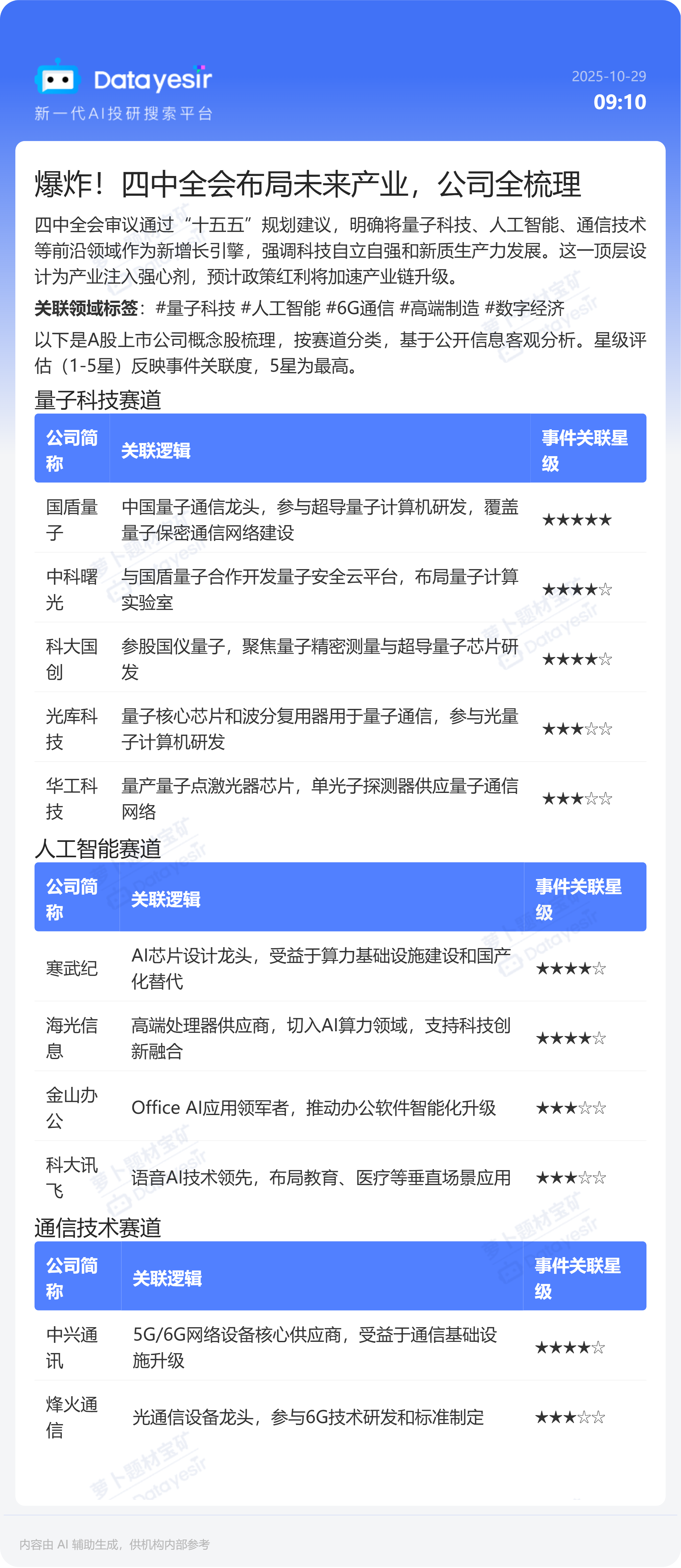 四中全会审议通过“十五五”规划建议,明确将量子科技、人工智能、通信技术等前沿领域作为新增长引擎,强调科技自立自强和新质生产力发展。