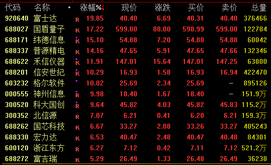 量子科技概念再度活跃,截至收盘,富士达涨近20%;国盾量子涨超17%,盘中一度涨停股价突破600元大关,续创历史新高;此外,禾信仪器涨近12%,科大国创涨近10%。