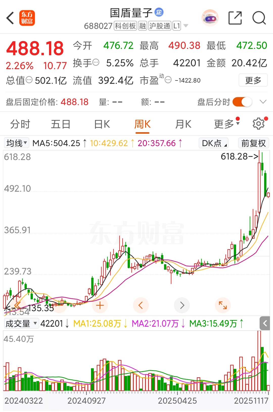 这周有三场国际量子科技大会,国盾量子上周五回踩周线五日均线,这周一开始国盾量子起